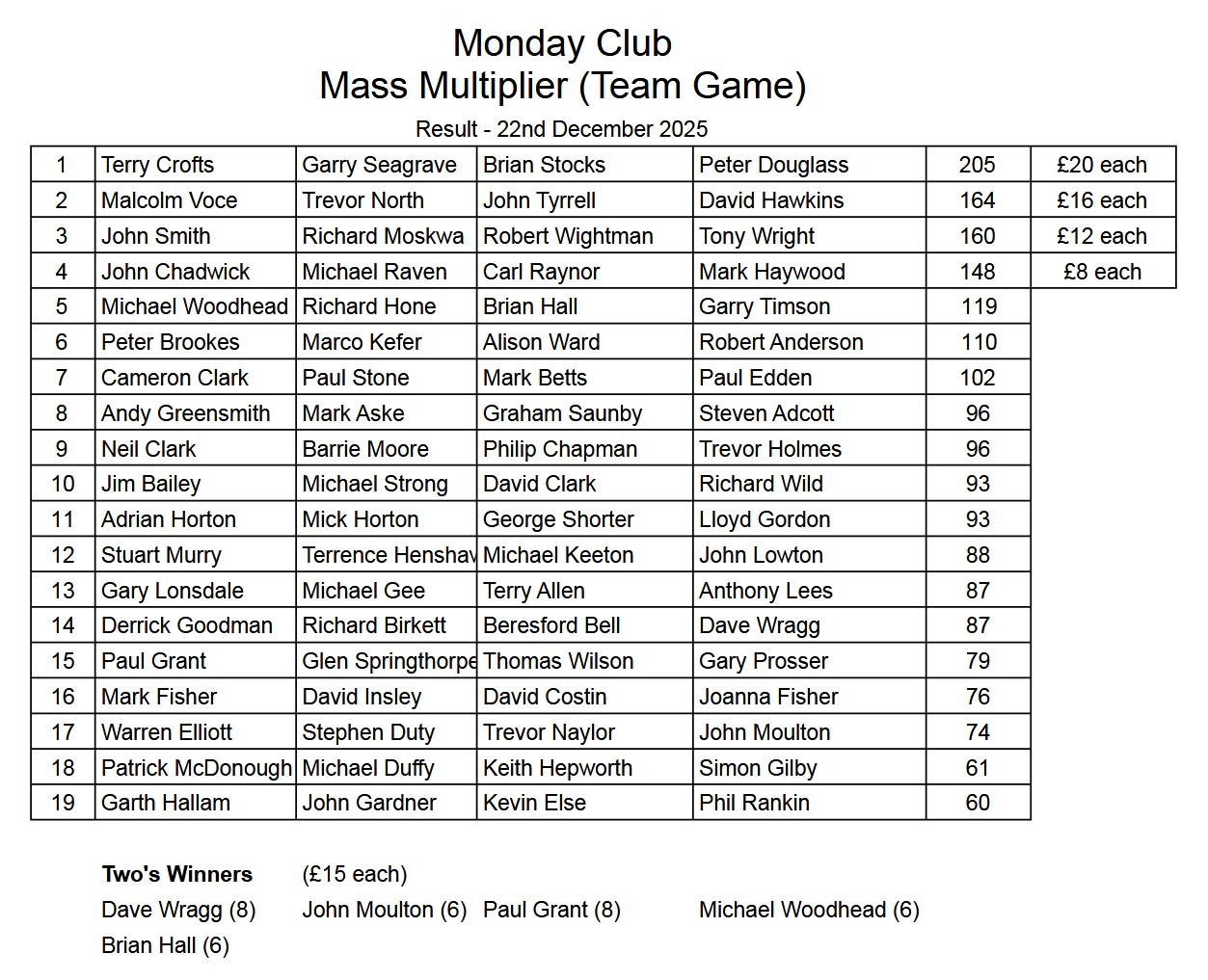 Monday Club – Mass Multiplier Result – 22nd Dec 2025